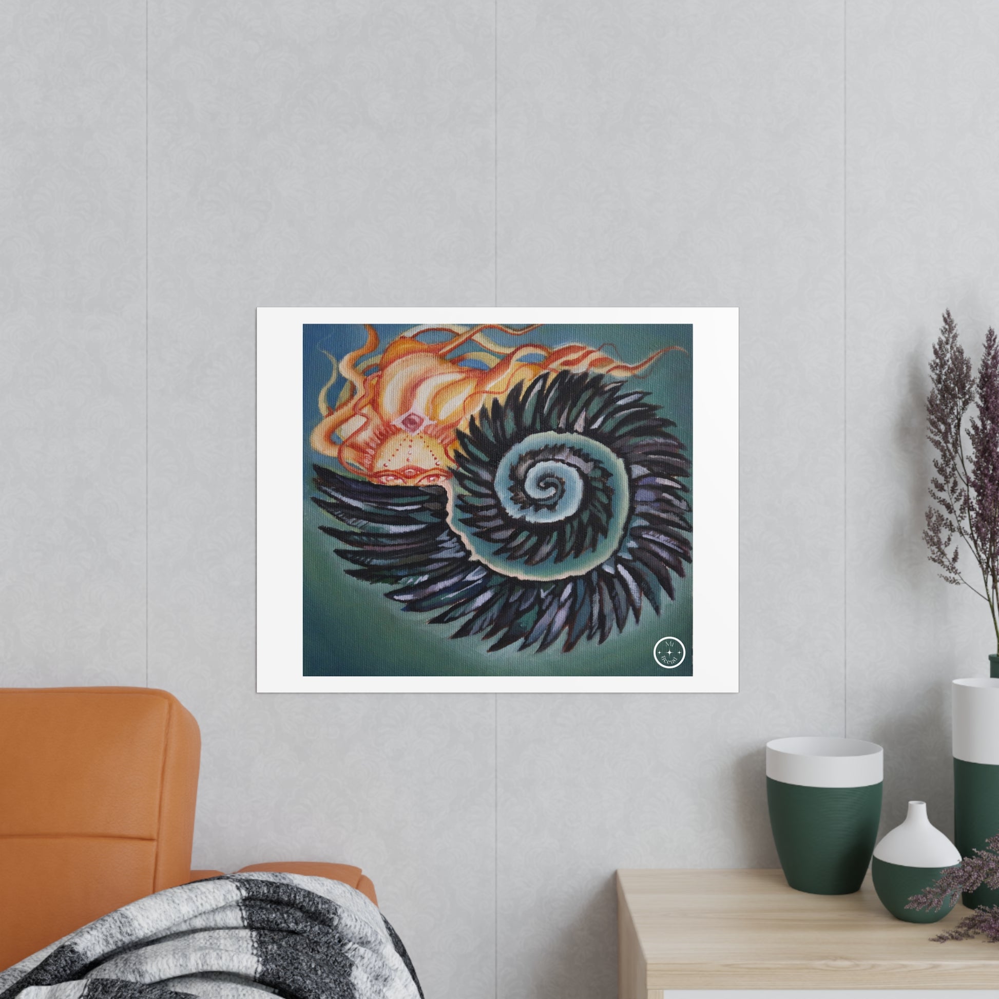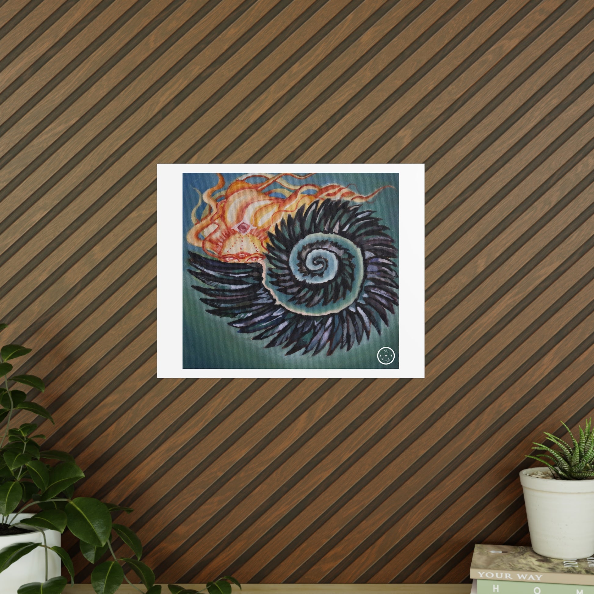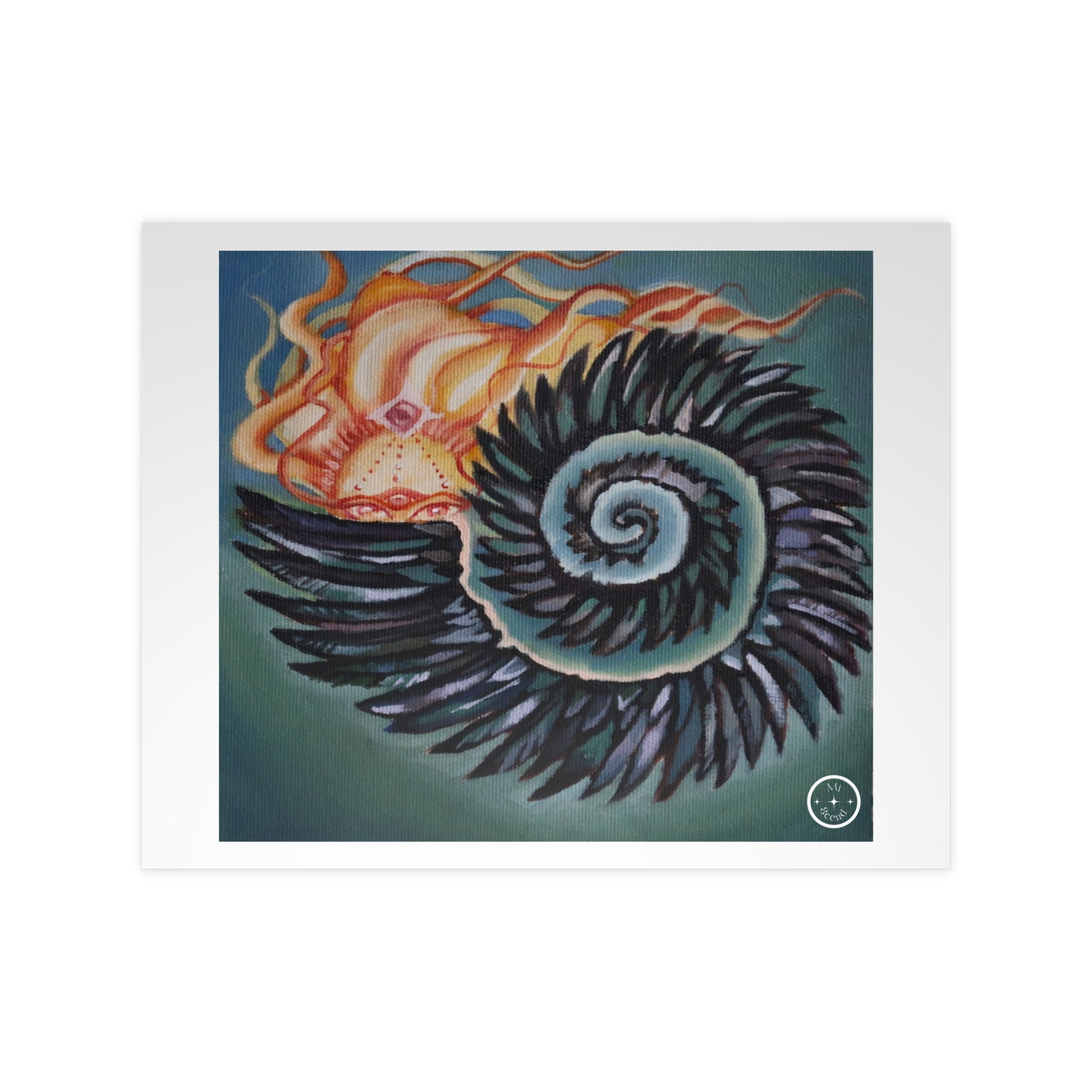 Hiding... but somehow, miraculously, emerging. A painting study made spring of 2025 depicting a Spirit Being hiding in a shell of feathers, inspired by the fibonacci sequences and patterns often found in nature.